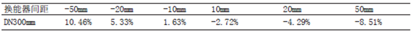 超声波流量计换能器的安装误差对测量结果影响很大,一定要按规定的尺寸安装。在DN300mm管线上以V法安装换能器,通过改变换能器安装间距,测试其间距偏差与误差的关系,见表5。